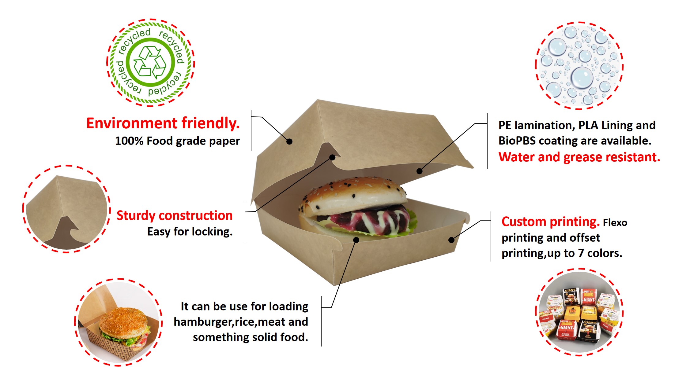 Product Name: | Burger / Meal box | Paper Type: | PE lamination, PLA linning, PBS coating, Water base |